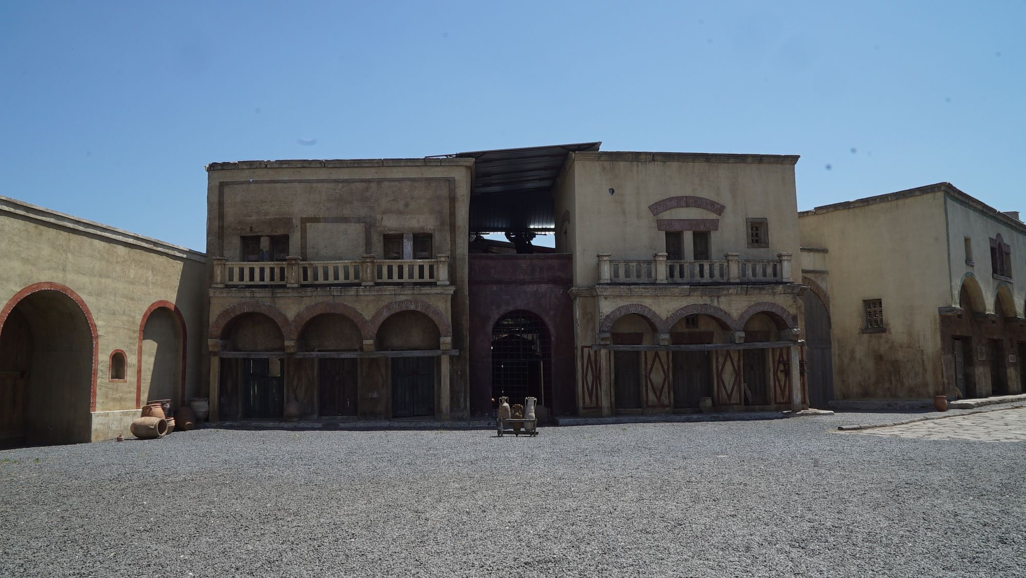 This set was designed by Marco Dentici for the TV series, Francesco (Michele Soavi, 2002). It has undergone many modifications over the years in order to provide the backdrop for a range of historical eras, such as: 15th century Tuscany for Amici miei – Come tutto ebbe inizio directed by Neri Parenti, the famous balcony scene for Carlo Carlei’s adaptation of Romeo and Juliet, a 17th century Italian borgo for the Netflix show La luna nera directed by Francesca Comencini, and contemporary Africa for Checco Zalone’s Tolo Tolo (Cinecittà si Mostra, “Sets: Guided Tours”).