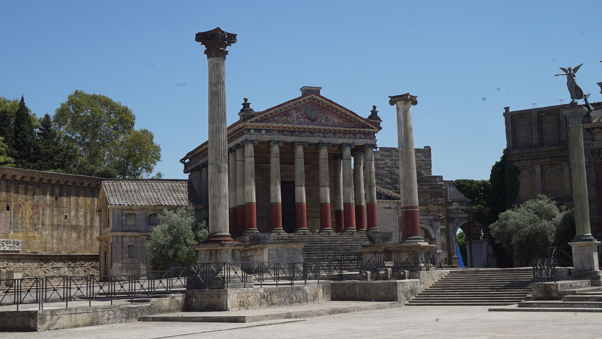 "presents the classic civil and religious buildings of the Roman Forum. The supporting structures are covered with wooden panels and fiberglass plates. The monumental set is characterized by a striking mix of colors: The bold hues of red, blue and green, along with the vibrant décor, help visitors visualize what the now whitened ruins actually looked like in the days of the Roman Republic."