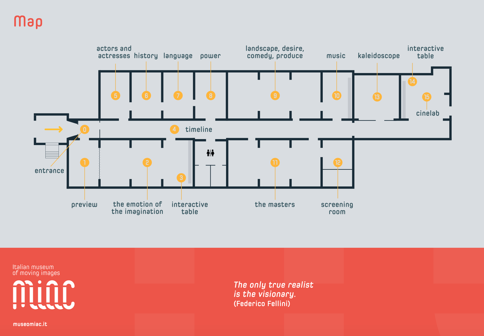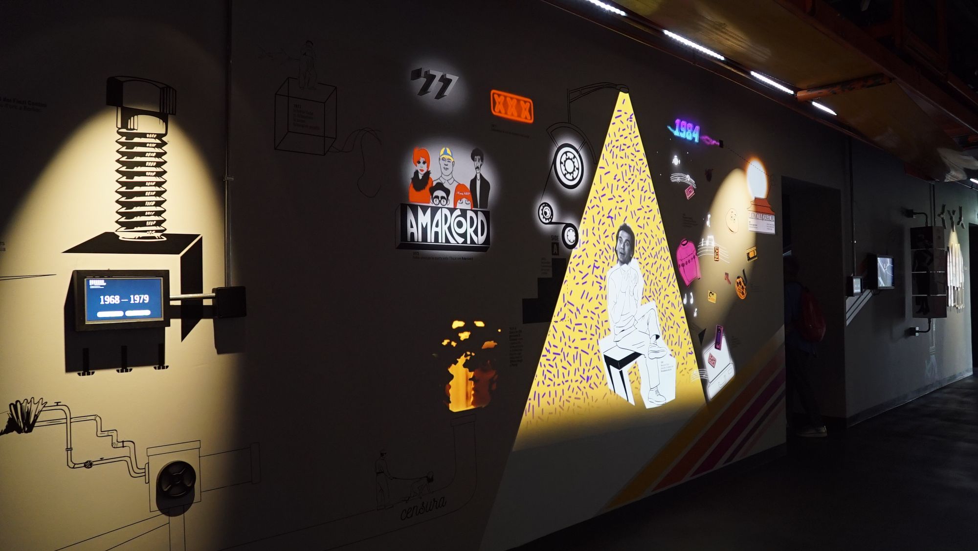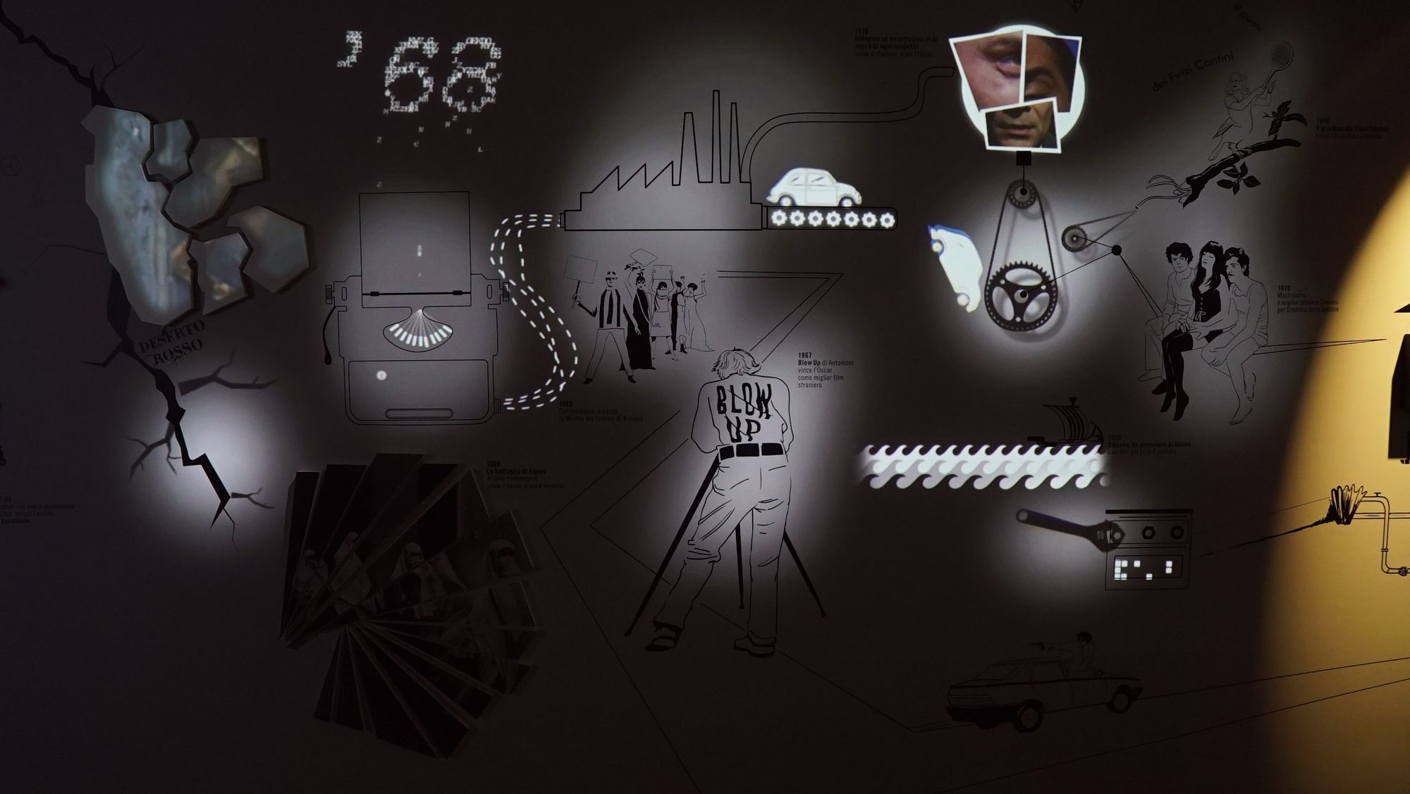 Room 4) The Timeline Corridor – A corridor over 30 metres long where the walls are adorned by animated, graffiti-style infographics about the history of Italian cinema.